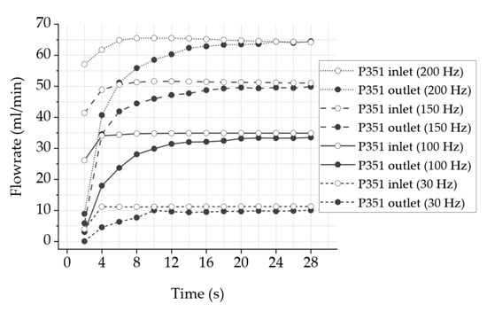 Time-dependent air volume flow as a function of time with micropump P351 and mounted periphery (Figure 3) measured with multiple frequencies, rectangular actuation signal and voltages between V and V compared between inlet and outlet.