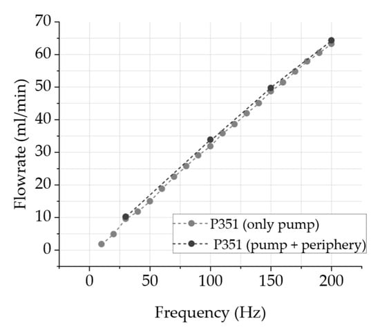 Figure 4 depicts the measured air volume flow of the four steel micropumps (type P32009) used []. This measurement is intended to initially determine the flow rate discrepancy between different micropumps to ensure that a calibration for high-dosing repeatability with several channels is achieved during operation. The samples are enclosed the same way in a housing that is used in the overall system. This characteristic frequency-dependent flow rate is measured with a Bronkhorst mass flow sensor.