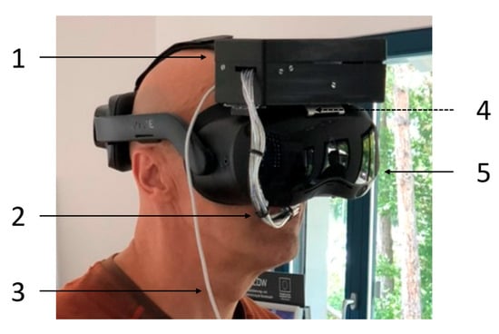 Head-mounted device including the developed prototype (1) of the odor delivery system with micropumps and the VR headset (5), which is attached to an aluminum plate (4). Odor/air mixtures are transported close to the human nose via PFTE tubes (2). The prototype version shown in this figure uses a cable connection (3) for power supply and communication.