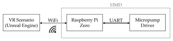Communication interfaces linking the Unreal Engine VR scenario of a stationary computer with the head-mounted device (HMD) integrated with Raspberry Pi and odor micropumps. The trigger signals from the VR scenario are transmitted wirelessly over WiFi to a Raspberry Pi. The Raspberry Pi subsequently transfers this signal by wire to the micropump driver using the UART protocol.