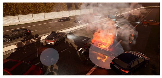 Scenario 1 includes a comprehensive scenario of a pile-up on a European highway: multiple cars, trucks, and dozens of differently injured patients. To increase the effect of immersion, the visual, auditive, and olfactory effects are on a maximal level of realism. We focus mainly on highly realistic visualization of wounds, adequate patient emotions, authentic sound and voice effects, and various odors true to reality. With the help of a comprehensive scenario editor, the setup of the auditive effects, all kinds and locations of patients’ traumata, and locations and types of odors can be predefined. To ensure the subject can perceive all effects, we want each injured person to be treated according to the TRIAGE m-START algorithm, which takes about 60 to 90 s. The time limit for our tests is set to 10 min but can be adjusted. While moving closer to the injured person or virtual assets, the intensity of the predefined odors increases and decreases when moving away.