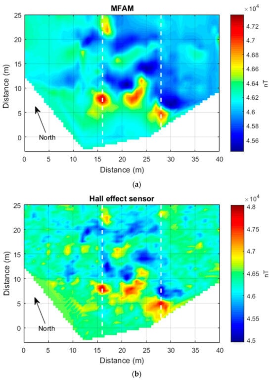 “Area 1” (Naples, Italy) case. (a) the Total field intensity acquired by an MFAM sensor. (b) The total field intensity computed by the three components of a Hall-effect sensor contained in a smartphone. Dashed lines mark the position of the profiles shown in Figure 2.