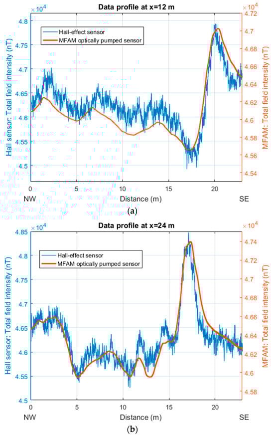 The two maps show the presence of intense anomalies in their central part (10 m < x < 25 m). These anomalies are mainly dipolar, including high and low areas. These highs and lows appear roughly oriented in the direction of the Earth’s magnetic field (IGRF model), which in this area has a declination of about 0° and an inclination of 56°. This may witness the presence of many highly magnetized objects, with the individual permanent magnetic moments tending to cancel out with the result of enhancing the induced magnetization effects. Overall, the MFAM data are much smoother than the Hall-effect sensor data that are affected by apparently random noise throughout the surveyed area. However, notably, the two maps give almost the same degree of information about the distribution of the magnetic anomalies in the area. This can be clearly seen when the two datasets are compared along profiles (Figure 2). This comparison shows well that the amplitude of the noise in the Hall-effect sensor data reaches 200 to 300 nT. Despite this noise, as the main anomalies in this area have a strong amplitude (>400 nT), along the two selected profiles, any anomaly visible in the MFAM data can also be identified in the Hall-effect sensor dataset (Figure 2). Other weaker anomalies visible in the MFAM map, such as those in the easternmost part of the area (x > 30 m), are instead hidden by the noise in the Hall-effect sensor map (Figure 1).