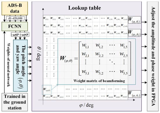 The current adaptive beamforming algorithms aim to minimize the missed detection probability of aircraft. They utilize genetic algorithms, co-evolutionary algorithms, and other methods to optimize the objective function and then adjust the beam direction and radius. However, these methods are hindered by a large amount of calculation and the inability to respond quickly, which is not conducive to satellite implementation. This paper proposes using machine learning to construct a neural network that rapidly responds to ground targets. The network will be trained with input data in advance to achieve a fast response to the distribution of input ground targets and an adaptive output beamforming scheme. This design inputs the aircraft’s position information into the neural network and outputs the pitch angle and yaw angle of the sub-beams. The range of the pitch angle and yaw angle, which is between +180 deg and −180 deg, is divided into 40 subintervals. Each subinterval corresponds to a weight matrix of beam synthesis, and such a one-to-one correspondence lookup table is established in the ARM, as shown in Figure 4. Input the adjusted the pitch angle and yaw angle to the ARM, and the ARM outputs the beam synthesis weight matrix against the lookup table. The matrix is fed into the beam synthesis module of the FPGA, and the multiplier is used to adjust the beam direction to achieve the adaptive adjustment of beam direction on the satellite.