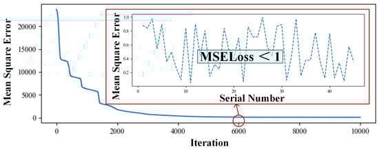 This design simulates the phased array antenna with seven sub-beams. The neural network is trained by the dataset constructed in Section 3. When the number of network layers is fewer than four network layers, the convergence algebra is too high, and the result often appears to be the problem of underfitting, which is not suitable for adaptive beamforming requiring fast response. When the number of layers is higher than eight, the convergence algebra decreases significantly, but more than 50% of the training results will show an overfitting phenomenon. Therefore, this design builds the six-layer fully connected neural network, and the number of neurons in the middle five hidden layers is set to 16,384, 8192, 2048, 1024, and 256. The change curve of the loss function, as shown in Figure 5, can be obtained when the number of cycle times is 7000. In order to more clearly observe the average variation trend of the loss function, this study accumulates the loss functions of all training sets to obtain overall losses. Therefore, based on the calculations in Equations (2) and (3), it can be inferred that as the training results tend towards stability, the mean square error for each group of training results is approximately 0.2998. This model utilizes a six-layer neural network, and the training results typically converge after 5000 epochs on average. The performance of this neural network is evaluated using the test set, and the situation where the test set is tested using the weighted network of the 6000th iteration is shown in Figure 5 and the loss of the test set is less than 1.