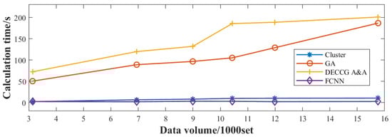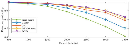 A comparison between the adaptively adjusted beam and the uniform beam is shown in Figure 6, and the detection probability of aircraft is increased by 15.68%. To further validate the adjustment effect of the neural network-based adaptive beamforming method, the same test data are inputted into the horizontal comparison calculation time and optimization ability of the four adaptive beamforming methods based on a neural network, clustering algorithm, genetic algorithm, and coevolutionary algorithm. The results are obtained in Figure 7. Figure 7 shows that the computation time of the beam adaptive adjustment technique based on FCNN is reduced by 15~80% compared with that based on Cluster, GA, and DECCG&AA. Moreover, the method has good robustness, and the calculation time does not increase significantly with the increase in the number of data groups. While the pitch angle and yaw angle of the beam are output, the number of aircraft in each sub-beam can be determined according to the new pointing of the beam to calculate the aircraft detection probability by using Formula (7). The comparison diagram intuitively demonstrates that the neural network-based beam adaptive method enhances aircraft detection probability by 10% to 80% in computation time compared with other methods. As shown in Figure 8, the optimization results show a similar improvement to the genetic algorithm-based beam adaptive method. They are significantly higher than those of the cluster-based beam adaptive method. Figure 8 shows that the probability of aircraft detection is greatly affected by the increase in the number of data groups. Furthermore, the neural network-based beam adaptive method exhibits good robustness in handling increased data volume, indicating stronger computing power than the other three algorithms.