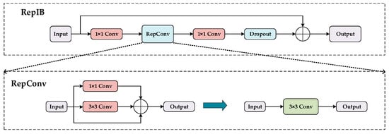 The reparameterized inverted block (RepIB) module is employed in accordance with the aforementioned formula to facilitate cross-layer connection, thereby ensuring a more seamless flow of gradients within the deep network. Finally, all the hierarchical items are connected, and the information is exchanged through 1 × 1 convolution, which enhances the model’s object detection ability in complex scenes. The RepIB structure, as defined in Equation (1), is shown in Figure 5. An increase in the network’s depth and width can lead to accuracy improvements. To this end, a module with an inverse residual has been designed [30,31]. Firstly, the number of channels is expanded through a 1 × 1 convolution, with an expansion factor of 4. Secondly, the RepConv structure is employed, with a multi-branch structure model used for training in order to optimize the performance of the network. During the inference phase, the concept of structural reparameterization [32] is employed to transform the network into a single-channel structure, which has the effect of reducing both memory usage and running speed. Subsequently, the network is downsampled by a 1 × 1 convolutional layer and passes through a dropout layer. During the training phase, a random selection of neurons is discarded, resulting in a different network structure at each training stage. This prevents the network from overfitting the training data, thereby improving the generalization ability and robustness of the model. The dropout rate is set to 0.1.
