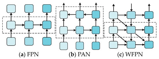 The YOLO series of algorithms employs the feature pyramid network (FPN) [9] and path aggregation network (PAN) [33] structures, as illustrated in Figure 7a,b. These structures permit the network to utilize features of varying scales, thereby facilitating the acquisition of contextual information and enhancing the algorithm’s capacity to detect both small and large objects. However, the flow path of contextual information in this structure is fixed and not sufficiently flexible. Consequently, a cross-level multi-scale feature fusion structure, WFPN, is proposed.
