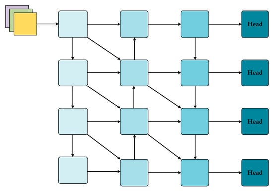 In the structure of the neck part, the feature information of different scales should be fully combined. However, the fusion mechanism of Generalized-FPN (GFPN) [34] will lead to an increase in the number of parameters and calculations. An increase in the number of complex feature fusions and processing will inevitably lead to an increase in resource consumption. Accordingly, we devised a WFPN configuration akin to a wave, which both establishes horizontal connections between feature maps at each level and vertical connections from the previous level, and it also accepts inputs from the previous level of horizontal connections. This structure is not constrained by a fixed flow path of contextual information, and the introduction of multi-path connections allows connections to be freely established between feature maps of different scales. Each feature map can benefit from information at multiple scales. Low-level feature maps (containing detailed information) and high-level feature maps (containing semantic information) complement each other, thereby enhancing the overall feature expression ability. The model connections are simple and efficient, ensuring multi-level feature fusion. The data flow of Figure 2 is drawn with reference to the structure of Figure 7c, as shown in Figure 8. We utilized the position features of the WFPN structure in the network model multiple times to enhance the utilization of detailed information.
