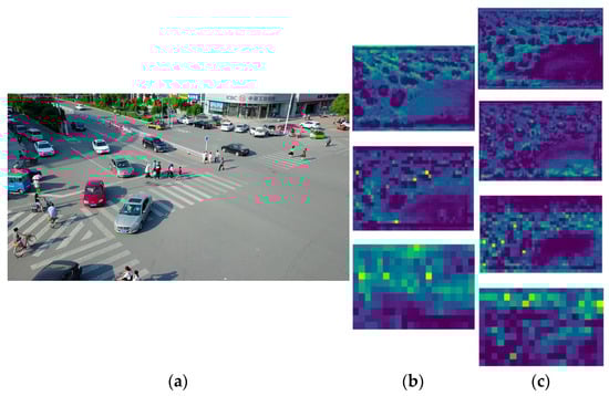 (a) Illustrates the image to be detected, (b) depicts the feature map of the three output layers without the small object detection head, and (c) presents the feature map with the small object detection head.