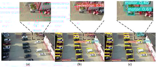 Figure 14a represents the original image, Figure 14b represents the detection result of YOLOv8n, and Figure 14c represents the detection effect of ESOD-YOLO proposed in this paper. Figure 14a depicts the scenario in which two motors are situated in the upper right corner. Figure 14b illustrates a scenario in which one motor is not detected, but the other is identified as a pedestrian. Figure 14c depicts a scenario in which both motors are successfully detected.