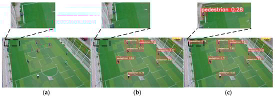 Figure 15a depicts the original image, Figure 15b depicts the detection outcome of YOLOv8n, and Figure 15c depicts the detection outcome of ESOD-YOLO as proposed in this paper. Figure 15a depicts a person in the upper left corner. However, the detection result in Figure 15b fails to identify this individual, whereas the proposed method in Figure 15c successfully detects it. Furthermore, the confidence level of the other individuals in Figure 15c is higher than that in Figure 15b, indicating that the model considers the detection result to be correct with a higher probability. This suggests that the model has a higher degree of feature matching for this object.
