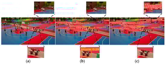 Figure 16a depicts the original image, Figure 16b illustrates the detection outcome of the YOLOv8n model, and Figure 16c depicts the detection outcome of the ESOD-YOLO model proposed in this paper. In Figure 16a, a group of people can be seen in the upper right corner. The detection result in Figure 16b demonstrates that the YOLOv8n model is unable to detect the group of people and erroneously identifies the bench in the centre of the image as a bicycle. Figure 16c demonstrates that the ESOD-YOLO model is capable of accurately detecting the group of people in the upper right corner of the image without misidentifying the bench in the middle of the image. It demonstrates that the ESOD-YOLO model is more accurate and robust in dealing with small objects and complex scenes and is significantly more effective than the YOLOv8n model.