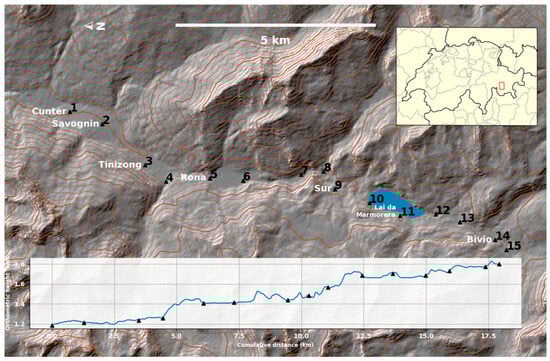 Figure 1. Surses region geoid profile in the Eastern Swiss Alps, where DoV, GNSS, leveling, and gravity observations were carried out on 15 benchmarks. The Shuttle Radar Topography Mission (SRTM) is visualized along the profile.