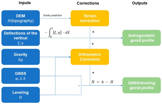 Figure 2. The data collection and analysis scheme for this study, including the types of datasets used and the flow of information in the reduction and processing of these data points into geoid profiles.