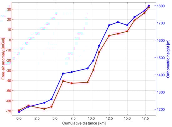 Figure 3. Free-air anomaly (red) versus the orthometric heights (blue).