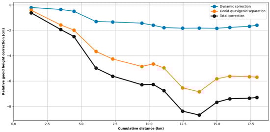 Figure 4. Geoid profile corrections (relative to the first mark) added to the quasigeoid profile derived from observed deflections of the vertical (DoV). These include the dynamic correction derived from observed gravity disturbances and the geoid-quasigeoid separation term.