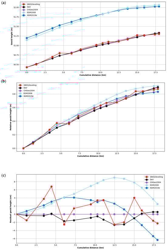 Figure 5. (a) Absolute geoid height results from GNSS/leveling and DoV compared with CHGeo2004, EGM2008, and XGM2019e. (b) The same results relative to the first mark in the profile. (c) The same results minus CHGeo2004.
