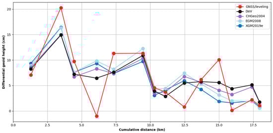 Figure 6. Differential geoid height calculation results from DoV, GNSS/leveling, EGM2008, and XGM2019e. To remove long-wavelength signals, each point shows the difference in geoid height between a point and the previous point in the survey.