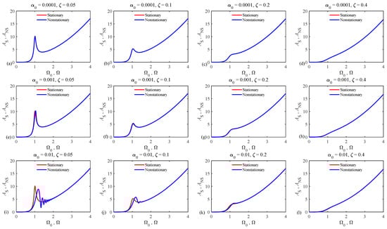 In addition, this figure provides a comparison between stationary and nonstationary results. Neglecting the nonstationary conditions (i.e., setting in Equation (6)), the stationary amplitudes of acceleration can be obtained as [35]