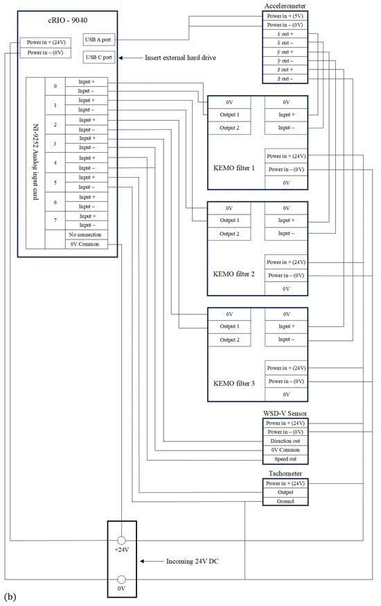 As Figure 4b demonstrates, the MEMS accelerometers are fed via USB port A, available on the data acquisition system. The outputs of these sensors are connected to KEMO filters, fed by a 24 V input DC voltage. The outputs of the KEMO filters are connected to the analog input card on the system. The WSD-V and inductive proximity sensors are directly connected to the analog input card and fed by the same 24 V DC input voltage. The recorded digital signals are transferred and saved to an external hard drive via USB port C on the system.