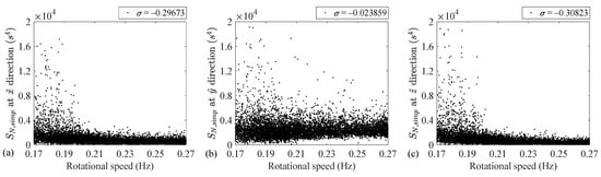 Every well-functioning piece of rotating machinery faces a permissible level of mass imbalance fault [34]. According to the available literature [19,34], dependency between the fundamental rotation harmonic intensity and the rotational speed indicates the existence of this fault. Figure 5 illustrates the variation of the conventional imbalance feature versus the rotational speed of the present wind turbine with permissible imbalance for all three directions. To quantify the dependency between these two parameters, the normalized cross covariance (i.e., σ) [49], corresponding to each direction, is also given in this figure. As Figure 5 demonstrates, this dependency is observable only for the direction. This observation is consistent with an expectation because the direction is placed within the plane of blade rotation, in which the centrifugal excitation, coming from the imbalance fault, has a reflection in this direction, and the stiffness of the turbine tower along this direction is less than the stiffness of the vertical direction (i.e., the axis). Therefore, the direction is the only candidate for imbalance diagnosis.