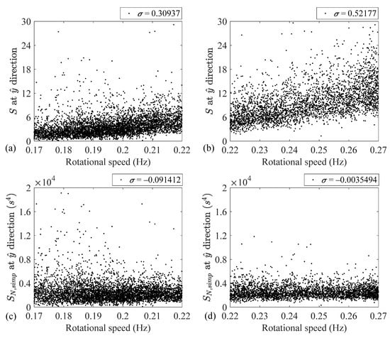 The present vibration data are captured and saved within 60 min time portions from a 2.3 MW wind turbine, as a typical representative of wind farm turbines, over a sufficiently long period of operation, covering multiple wind speeds and multiple rotational frequencies over the whole operational frequency range. Taking a 50 s time window with 40% overlapping, features S and are extracted in all three directions. The total number of each feature (i.e., feature S or feature in each direction) is 8181, the rotational speeds are in the range of 0.17 to 0.27 Hz and the minimum and maximum wind speeds over the investigated period take the values of 4.7 m/s and 10.7 m/s, respectively. Since the aim of the experiment is to justify the speed independency of the proposed diagnostic feature, and the collected data cover all possible rotational speeds, the presented experimental justification will be sufficient for validating the presented theoretical background. Taking into account the universal theoretical character of the background, there is no need for adjusting the proposed diagnostic feature for other wind turbines.