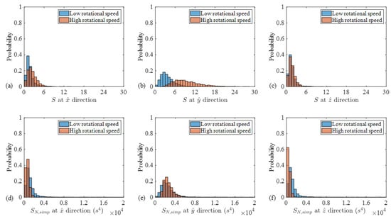 Histograms of S (a–c) and (d–f) associated with the low and high rotational speed regimes.