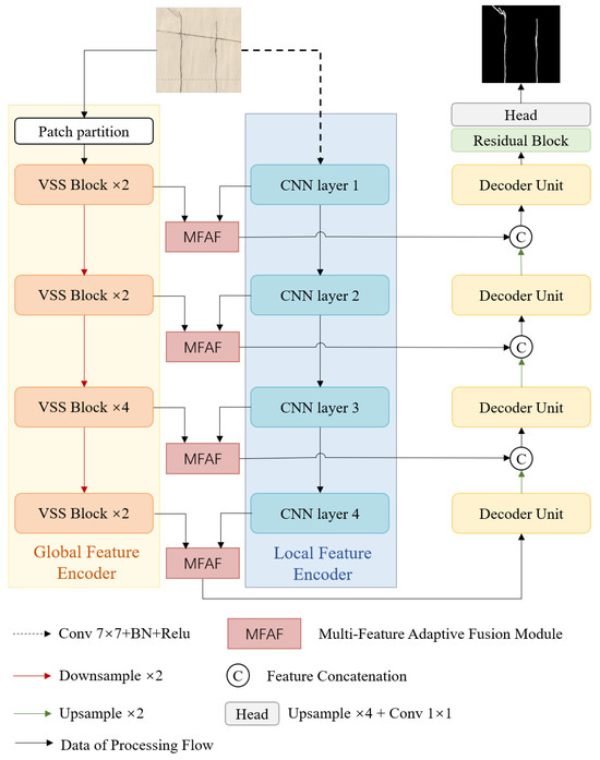 For the feature extraction, the CNN network and Mamba model focus on different aspects, where the former is concerned with local patterns and the latter pays attention to global long-range dependencies. Through utilizing the CNN and Mamba as the dual-encoding branches, both local detailed information and global features are captured so as to increase the accuracy of crack recognition.