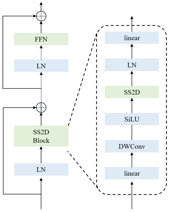 The core component of the VMamba is the visual state-space block, as shown in Figure 2. The VSS block consists of two residual modules to effectively mitigate the problems of gradient vanishing and gradient explosion through residual connection, making the network easier to optimize. To be specific, the input feature map is divided into two branches, one of which is fed into the 2D selective scan block (SS2D block) after the layer normalization, followed by an element-wise addition operation with the original features of the other branch. In the SS2D block, before being fed into the SS2D which is the most important component of the SS2D block, it is necessary for feature maps to pass through the linear layer, the DWconv, and the SiLU activation function to enhance the nonlinearity and improve the network’s performance. Another layer normalization function and linear layer are employed to map the input data into a new space to form a higher-level feature representation. After passing through the first residual block, the corresponding output features are fed into the second residual block. Similarly, the second residual block is also divided into two branches, one of which is fed into the feed-forward neural network (FFN) layer after the layer normalization, performing further feature extraction and transformation of the data, and then the element-wise addition operation is applied to fuse it and the features of the other branch to obtain the final output features of the VSS block.