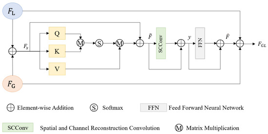 In order to fully utilize local and global features extracted from the dual-encoding network, a multi-feature adaptive fusion module is designed with the self-attention mechanism and the SCConv. Figure 3 illustrates the detailed structure of the proposed MFAF module.