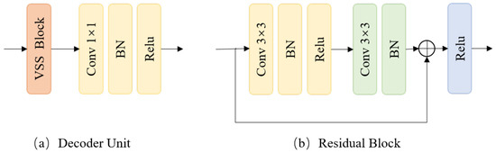 To make full use of the ability to model long sequences and capture long-range dependencies of the Mamba and the capabilities of the CNN model to extract local features, we combine the VSS block and the CNN model to design a decoder unit as shown in Figure 4a. Specifically, the fusion feature maps are fed into a VSS block, followed by a convolution module composed of a 1 × 1 convolution layer, a batch normalization (BN), and a rectified linear unit (Relu) activation function.