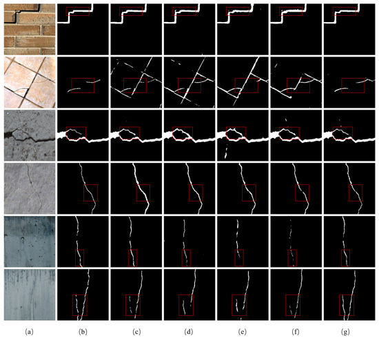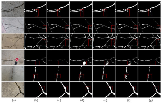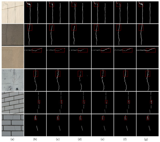 Visualization results of comparison experiments on the CrackSeg9k dataset. (a) Raw image; (b) ground truth; (c) CrackSegNet; (d) EMRA-Net; (e) CrackFormer-II; (f) APFNet; (g) proposed LGFAF-Net. Distinct regions are marked with red boxes.