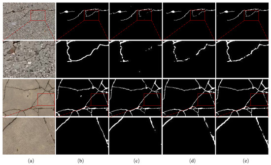 The visualization results are shown in Figure 11. To observe more carefully, we enlarge the key area. From the third to the fifth column, the segmentation results are approaching the ground truth, which shows that each of our proposed modules is useful for crack segmentation. It can be observed that the baseline has extracted the overall crack area, but has performed poorly for some subtle areas. With the addition of the CNN local feature extraction branch, the detail areas are better recognized. With the addition of the designed MFAF module, the local and global features from the dual branches are better fused to facilitate the learning of the representative feature features, and the segmentation results are closest to the ground truth.