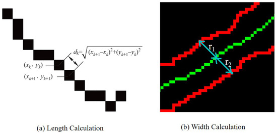where , and , are the pixel coordinates of the kth and (k+1)th pixel point, respectively. The total length of the cracks is as follows: