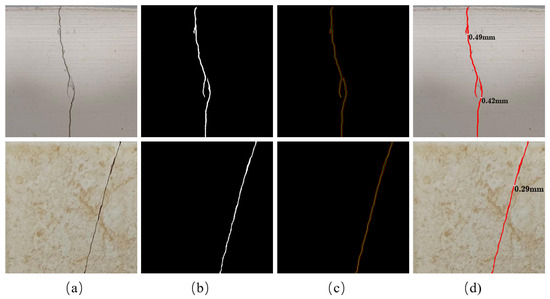 where represents the pixel length of the crack, s the calculated actual length of the crack, represents the pixel width of the crack, is the calculated actual width of the crack, is the real width of the crack measured with a crack meter, is the error of crack width identification, and is the ground sampling distance, which is the actual distance corresponding to one pixel. For these two sets of images, is 0.098 mm/pixel, which means the actual distance corresponding to one pixel is 0.098 mm. The visualization process is shown in Figure 13.