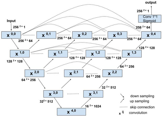 U-Net and U-Net++ (ours): Our proposed benchmark models, illustrated in Figure 3 and Figure 4, are based on U-Net [13] and U-Net++ architecture [14], respectively. We implemented the models in Python using Keras API with TensorFlow as its backend. The training dataset was augmented with rotation, zoom, width, and height shifts to improve the model’s generalization capability. The models are trained with the image resolution of 256 × 256, batch size of 8, Adam optimizer with a learning rate of , binary crossentropy loss, and early stopping.