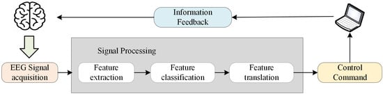 The brain–computer interface (BCI) is a promising technology that can improve the quality for life of people who may have lost the ability to communicate or interact physically with their surroundings using conventional augmentative technologies [1]. It provides a new medium for communication between people and computers by converting brain electrical activity signals into actionable commands to control external devices without the involvement of peripheral nerves and muscles [2]. Many neurophysiological electroencephalogram (EEG) signals have been used to convert human intentions into commands that BCIs can understand, and this EEG signal is called an EEG control signal. Figure 1 illustrates the process flow of BCI technology in converting brain electrical signals into control commands [3].