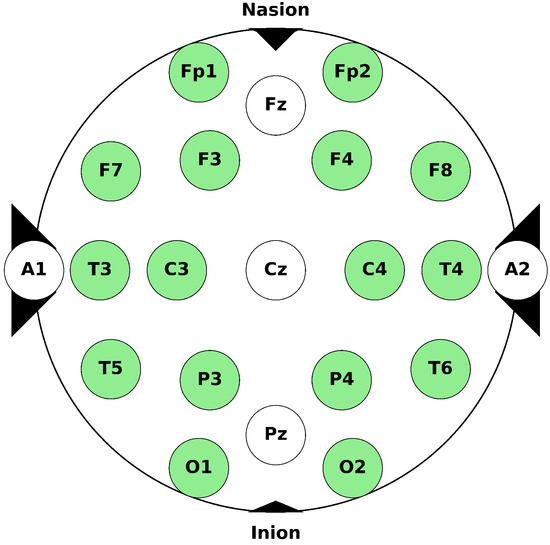 The EEG signals were recorded in a room without any electronic equipment interference using an OpenBCI device [49]. According to the International 10–20 system [50], the electrode impedance was kept below 10 k. As shown in Figure 2, brain activity was initially recorded from 16 channels, specifically Fp1, Fp2, F3, F4, C3, C4, P3, P4, F7, F8, T3, T4, T5, T6, O1, and O2. Among them, the eight most effective channels, F3, F4, C3, C4, P3, P4, O1, and O2, were chosen for data analysis and classification based on the significance of their contribution to SSVEP-BCI performance. This was expected due to their positioning corresponding to the motor and visual cortical areas, as supported by previous studies [51]. In turn, this ensured that the most relevant signals were analyzed, optimizing the classification performance and reducing computational complexity. Additionally, Figure 2 includes electrodes Fz, Cz, Pz, A1, and A2 for reference purposes. Though not used in the current study, these electrodes are part of the full 10–20 system layout, with A1 and A2 serving as reference electrodes and Fz, Cz, and Pz providing standard midline placements.