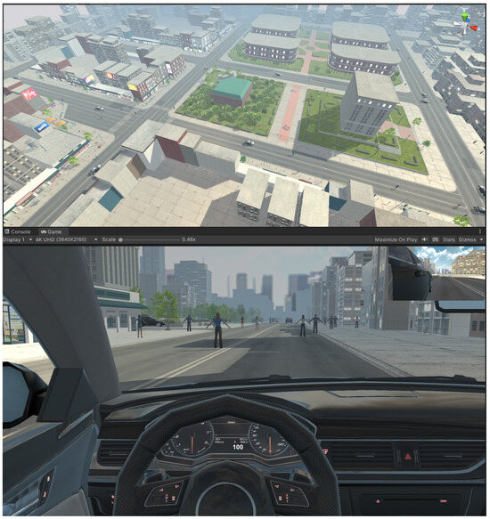 An immersive VR driving environment was created using the Unity platform to enhance the object control ability of the participants through a BCI. The VR setting, shown in Figure 5, featured a city landscape, including buildings, pedestrians, streets, and moving vehicles, simulating real driving conditions. The participant’s task was to operate a virtual vehicle moving forward with acceleration, deceleration, and left and right commands, avoiding collision with objects or pedestrians on the road. The vehicle’s default movement was forward, with acceleration and deceleration to increase and decrease its velocity. The experiment required continuous control of the virtual vehicle through real-time commands. For example, accelerating the vehicle from 20 to 40 m/s required the participant to maintain a constant acceleration command. The virtual driving experiment took six minutes.