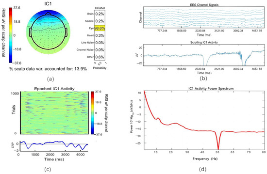 The EEG data were subjected to ICA analysis to remove artifacts and improve their quality and interpretability. The data were first centered during preprocessing by subtracting and whitening the mean to standardize the components’ variance. ICA was then applied to decompose the data into statistically independent sources. Figure 6 shows the ICA results of a short period of EEG signal. It reveals that the first independent component, IC1, predominantly represents the eye movement artifacts, accounting for 98.6% of this component’s variance. We can observe the brain activity energy topography of IC1 (Figure 6a), its temporal activity (Figure 6b,c), and its power spectrum (Figure 6d). These visualizations help identify artifacts and guide the process of removing them from the data. This step is crucial as it isolates the neural activity of interest by eliminating components corresponding to non-neural artifacts, resulting in cleaned EEG data suitable for further analysis and classification.