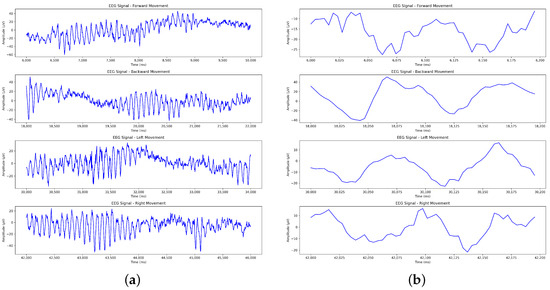 EEG signals from the O1 channel for forward, backward, left, and right movements. (a) The EEG signals of each movement during a 4 s action period. (b) The EEG signals of each movement during the first 200 ms for viewing details.