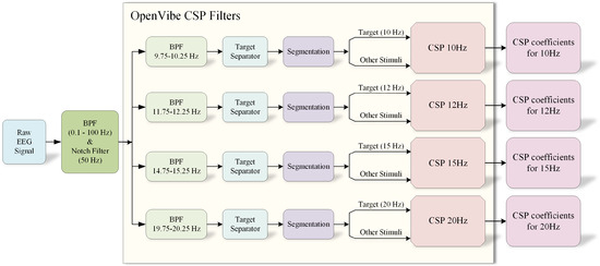 We systematically analyzed the frequency band power corresponding to the four SSVEP stimulation frequencies (10, 12, 15, and 20 Hz) to extract features from the EEG signals. Figure 8 shows that the raw EEG signals are initially processed through the OpenVibe CSP Filters. These filters help isolate the frequency components corresponding to the SSVEP stimuli. The Target Separator, implemented via ICA, separates the independent components for each frequency band.