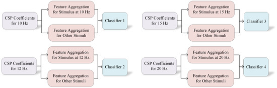 Figure 9 shows that the CSP coefficients corresponding to the four target frequencies are aggregated and converted into feature vectors for brain activity classification with machine learning. The CSP coefficients for each data segment are calculated for the target and nontarget stimulation frequencies. Specifically, two CSP coefficients are extracted for each frequency, resulting in eight CSP coefficients for each segment of the four target frequencies. Out of the 16 EEG channels, 8 channels were selected for data analysis and classification, as described in Section 4.2. Focusing on these channels ensured that the data contained meaningful information for the classification task while reducing computational complexity. The CSP coefficients were calculated from the signals of these selected channels. The feature vectors were then input into frequency-specific classifiers for brain wave activity classification. The classifiers used in this study included LDA, SVM, and multilayer perceptron (MLP).