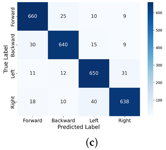 According to the confusion matrices shown in Figure 10, each classifier exhibits different performance characteristics when classifying the four motor movements. Figure 10a shows higher levels of misclassification, particularly between backward and right movements, highlighting the limitations of LDA in distinguishing complex, overlapping EEG patterns. Figure 10b presents higher accuracy results than LDA. However, it still has difficulty distinguishing actions such as left and backward movements. Figure 10c shows the best performance, with a lower overall misclassification rate. Nevertheless, movements such as left and right remain challenging for classifiers in EEG-based systems due to their similar neural signatures. The best classification accuracies for movements of forward, backward, left, and right are 90.72%, 90.83%, 90.33%, and 88.27%, respectively. Overall, an average accuracy of 89.88% can be achieved with the SVM.