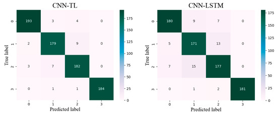 As shown in Figure 11, the confusion matrix of the four different models displays the classification results for four lower limb movements, clearly demonstrating that the proposed CNN-TL model accurately identifies various lower limb movements based on the surface EMG signals from the seven channels of the lower limb. In the confusion matrix, the diagonal elements represent the quantity of samples correctly classified for each action, while the non-diagonal elements indicate the quantity of samples incorrectly classified. The categories are defined as follows: 0 for walking, 1 for ascending stairs, 2 for descending stairs, and 3 for squatting.