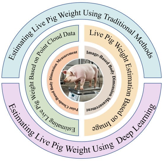 With the development of modern information technology, technologies like computer vision and artificial intelligence have made it possible to indirectly estimate the weight of pigs [8]. Computer vision can collect pig data without stress or contact, allowing researchers to observe and analyze it carefully. By using the methods of pig body size characteristics and characteristic classification, the weight of pigs can be automatically estimated, and this technology has become an important means for estimating pig weight [9]. Extracting the body characteristics of pigs is the core aspect of estimating pig weight based on computer vision. Currently, the visual estimation of live pig weight mainly includes two methods: based on images and based on three-dimensional point clouds. Most domestic and foreign research scholars construct pig weight estimation models according to the body shape and body size characteristics of pigs. In recent years, with the rapid development of deep learning methods, algorithms such as image classification, object detection, and image segmentation based on deep learning have provided reliable technical support for data processing and analysis, and the technology of estimating pig weight based on computer vision has encountered new development opportunities. Compared with other livestock species, the breeding epidemic prevention level of pigs is higher. During the 6–8 months from the birth of piglets to slaughter, it is necessary to measure their body weight multiple times. Moreover, pigs cannot obtain the weight estimation parameters through a fixed channel like cattle and sheep. Therefore, the weight estimation methods applicable to other animals are difficult to apply to pigs.