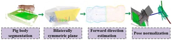 Figure 4 illustrates the process of normalizing livestock posture. The body dimension parameters of the collected livestock are calculated from the point cloud data, a weight prediction model is established, and the correlation between body dimensions and weight is analyzed to predict the weight of live pigs.