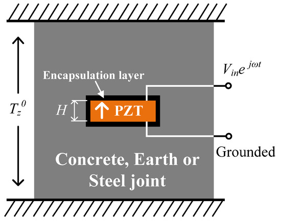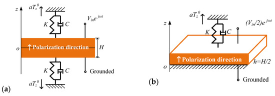 As shown in Figure 1, a piezoelectric plate covered with continuous electrodes on the upper and lower surfaces and encapsulated by insulating material is embedded in an engineering structure. The surrounding environment of the piezoelectric plate is reinforced concrete, foundation soil or a steel joint. Due to the external static load applied on the engineering structure, the embedded piezoelectric plate is subjected to static stress through the surrounding media. Note that a positive value of indicates tensile stress, while a negative value of indicates compressive stress. The upper surface of the embedded piezoelectric plate is subjected to a harmonic external voltage , and the lower surface is grounded. Simplified models of the embedded piezoelectric plate are illustrated in Figure 2. In the simplified full-scale model presented in Figure 2a, the cross-sectional area of the plate is denoted as , and the thickness of the plate is represented by H. As shown in Figure 2a, the piezoelectric plate is sandwiched by a pair of viscoelastic constraints with stiffness of K and a viscous damping coefficient of C. The piezoelectric plate is subjected to a static load through the viscoelastic constraint ( is the internal static stress of the structure, where a positive number indicates tensile stress and a negative number indicates compressive stress). Herein, the viscoelastic constraint is a simplification of the surrounding environment, and the static stress is considered to be the initial stress of the piezoelectric plate. As for the electrical loading, the lower surface of the piezoelectric plate is grounded, while the upper surface is subjected to a harmonic external voltage . From the perspective of the displacement field, the simplified full-scale model presented in Figure 2a is a symmetrical structure subjected to symmetrical loads, which means it can be further simplified to a semi-thickness model, as presented in Figure 2b. The semi-thickness model is actually the upper half of the full-scale model with adjusted electrical boundary conditions. In the semi-thickness model, a semi-thickness piezoelectric plate with a thickness of is bonded on a rigid surface. The upper surface of the plate is subjected to a static tensile load through the viscoelastic constraint, and the static stress is considered to be the initial stress of the piezoelectric plate. As for the adjusted electrical boundary conditions, the lower surface of the piezoelectric plate is grounded, while the upper surface is subjected to a harmonic external voltage . Using the semi-thickness model, the mechanical and electrical components of the embedded piezoelectric plate can be obtained. It should be noted that from the perspective of circuit connection, the full-scale model consists of two semi-thickness model connected in series. This indicates that the full-scale model and the semi-thickness model have the same input current but different input voltages. In the following impedance characterization of the embedded piezoelectric plate, the input voltage of the full-scale model and the input current of the semi-thickness model are adopted.