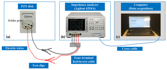 Experimental setup: (a) sample PZT disk, (b) impedance analyzer, and (c) data acquisition computer.